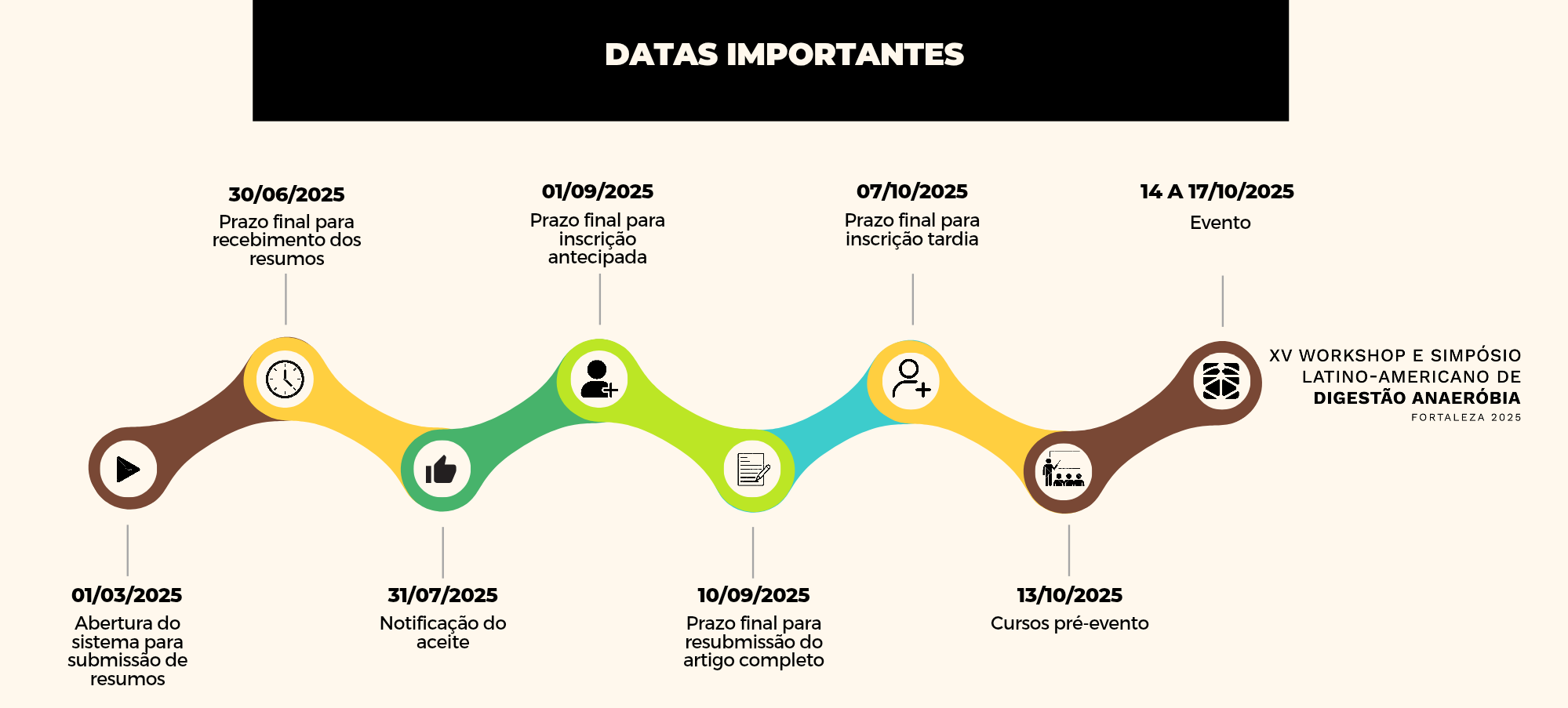 O XV Workshop e Simpósio Latino-Americano de Digestão Anaeróbia: Contribuindo para a transição energética e descarbonização, ocorrerá em Fortaleza, Ceará, no período de 14 a 17 de Outubro de 2025. O objetivo principal é propiciar discussões sobre os novos avanços e desafios científicos e tecnológicos dos processos relacionados com o tratamento anaeróbio de resíduos sólidos e líquidos, revalorização de resíduos, transição energética e captura de CO2, recuperação de energia via metano ou hidrogênio, recuperação de nutrientes e compostos químicos de base, reúso de águas e lodo, entre outros produtos preciosos, enfatizando a sua contribuição para a economia circular, além de promover a troca de conhecimento entre academia, sociedade, órgãos governamentais e setor empresarial.